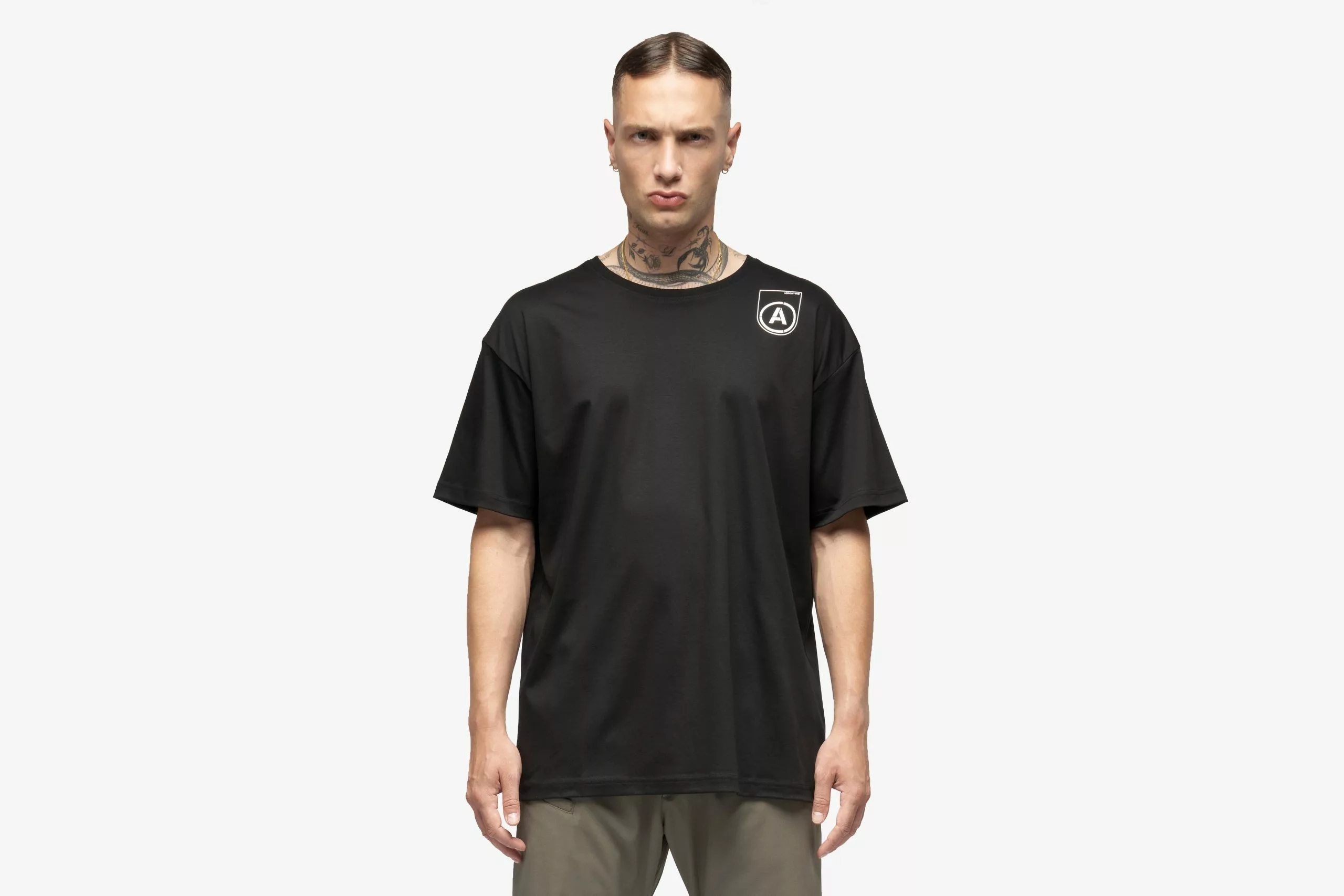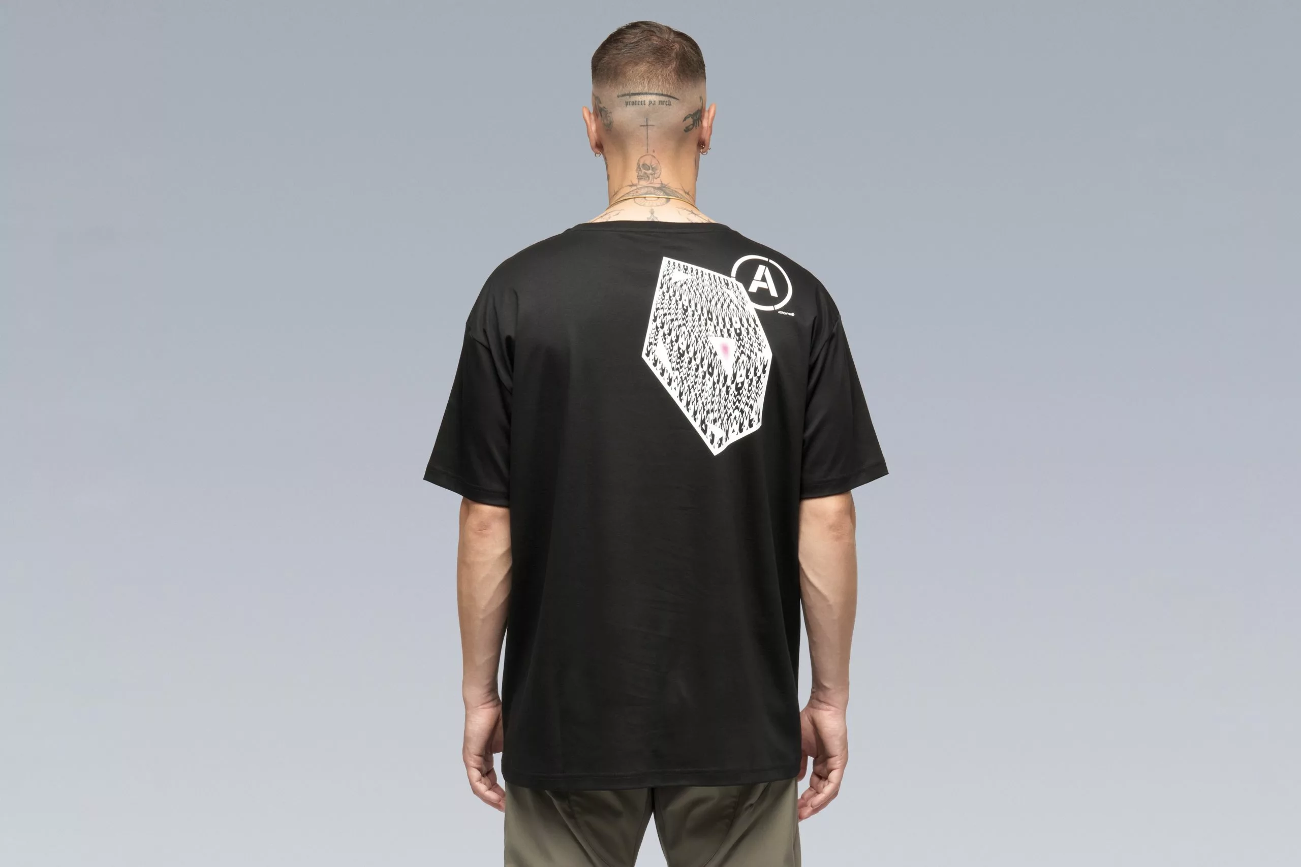 Acronym drop B lands at HANON proving once again its futuristic function first design & high quality construction is unlike anything else. The S24-PR-B is a 100% mercerized cotton short sleeve T-shirt that features subtle branding on the front with a small ACRONYM logo screen-printed at the left shoulder. The back features a slightly larger graphic printed at the right shoulder.