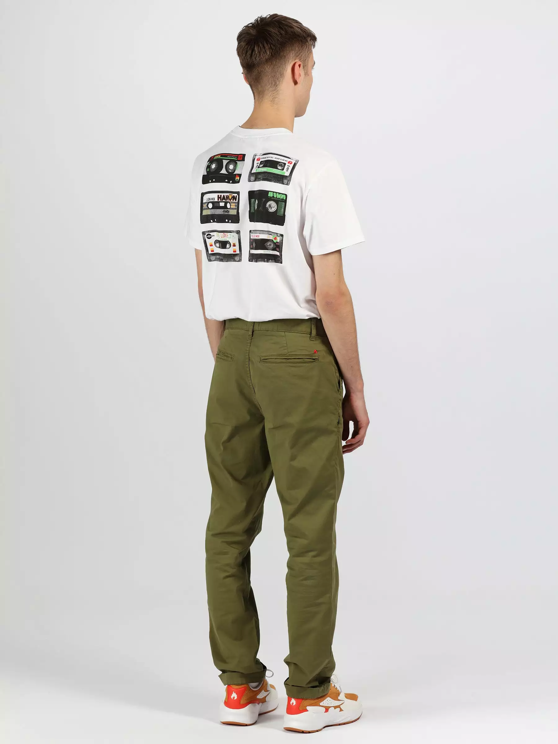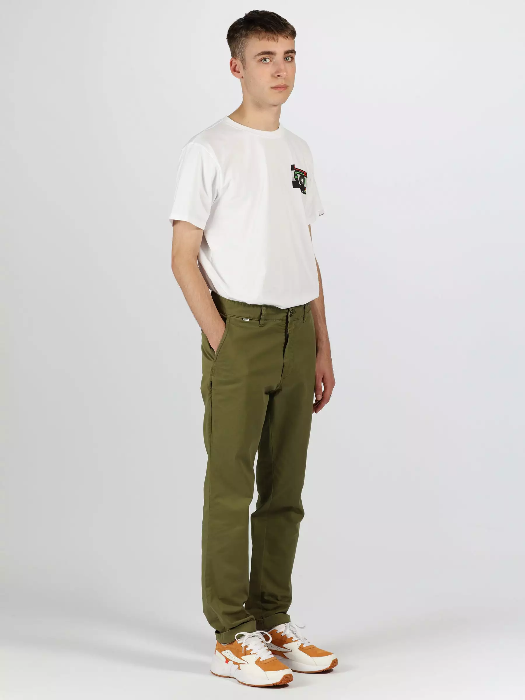 The HANON Billy Chino in Avocado Green is crafted in Portugal using 240gr garment dyed cotton twill and features double side entry pockets, woven flag label, single welt rear pockets, flame embroidery, YKK zip fly, and a concealed zip side pocket.